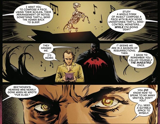 O plano de Batman é usar o músico para compor uma peça que colocará os Azmer de volta para dormir por meio da engenharia reversa das escalas e notas que os Orghams usaram para controlar a ameaça infernal. Em troca, Wayne oferece ao Maestro a liberdade da prisão.