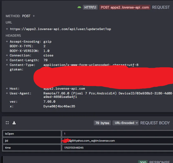 Quando o atacante atualiza sua lista de contatos, o servidor XMPP retorna tanto o JID falso quanto o real da vítima. O problema é que o JID real é construído usando o endereço de e-mail verdadeiro do usuário no formato usuario!!!dominio.com_w@im.lovense.com, permitindo que atacantes extraiam facilmente o e-mail real. Por exemplo, se o sistema retornar joao!!!gmail.com_w@im.lovense.com, o e-mail verdadeiro é joao@gmail.com.