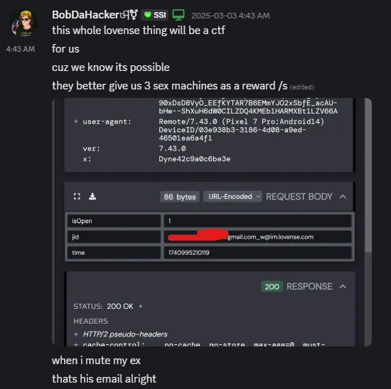 BobDaHacker descobriu a vulnerabilidade de forma casual ao usar o aplicativo da Lovense. “Tudo começou quando eu estava usando o app da Lovense e silenciei alguém. Só isso. Apenas silenciei a pessoa. Mas então vi a resposta da API e pensei… espera, isso é um endereço de e-mail? Por que isso está aí?”, relatou o pesquisador em seu blog.