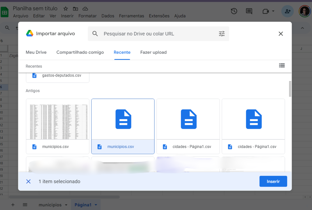 Também é possível importar os dados de um CSV para uma planilha existente: