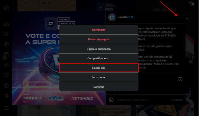 - Clique no ícone de três pontos do lado dela e selecione “Copiar link”;