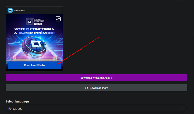Após inserir o link no Snapinsta, basta clicar em “Download Photo para baixar o conteúdo (Imagem: Captura de tela/Fabrício Calixto/Canaltech)