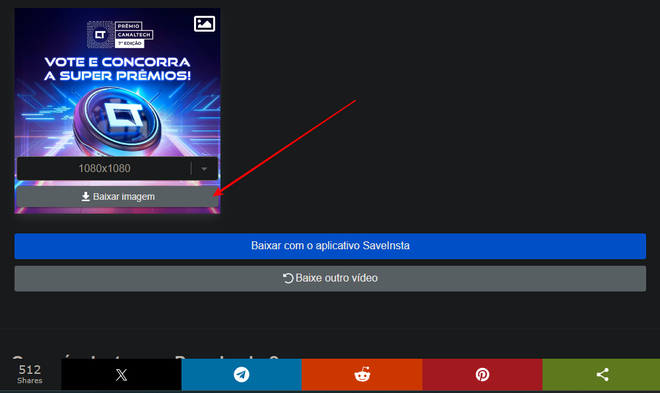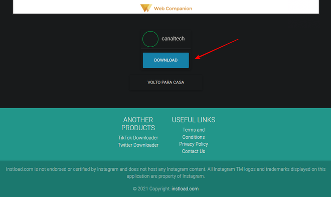 Depois de colar o link da foto no InstLoad, é só clicar em “Download” para baixá-la (Imagem: Captura de tela/Fabrício Calixto/Canaltech)