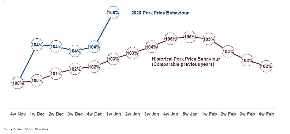 A equipe do banco elaborou um gráfico comparando a evolução dos preços da carne de porco do fim de novembro de 2019 à primeira semana de 2020 com o comportamento médio histórico desses valores no mesmo período. A imagem revela que se a tendência de anos anteriores for mantida o rali dos preços da carne suína pode não ter atingido ainda seu pico.
