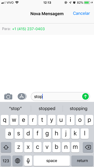 2. Em seguida, digite o número do destinatário: +1 415 237 0403. Envie para esse número uma mensagem com a palavra “stop”, conforme demonstramos abaixo: