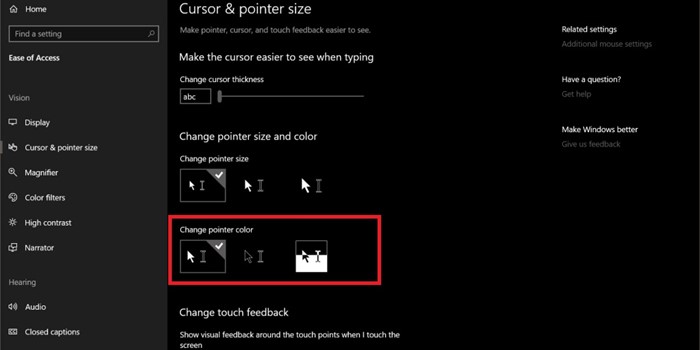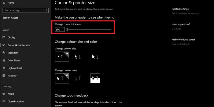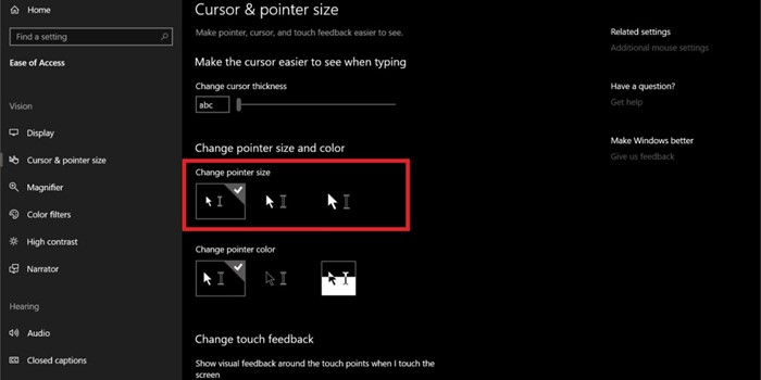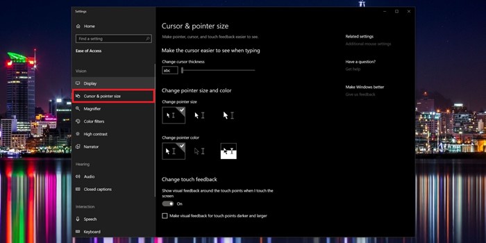 2. Do lado esquerdo da janela, procure pela seção “Tamanho do cursor e do ponteiro”;