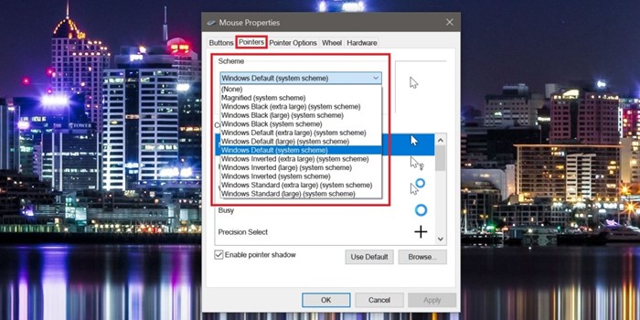 3. Em “Propriedades do Mouse”, escolha o esquema de setas na aba “Ponteiros”. Existem esquemas predefinidos que alteram as setas nas várias ocasiões de uso do sistema, com opções de tamanhos e cores diferentes;