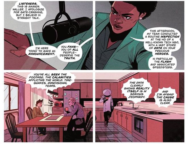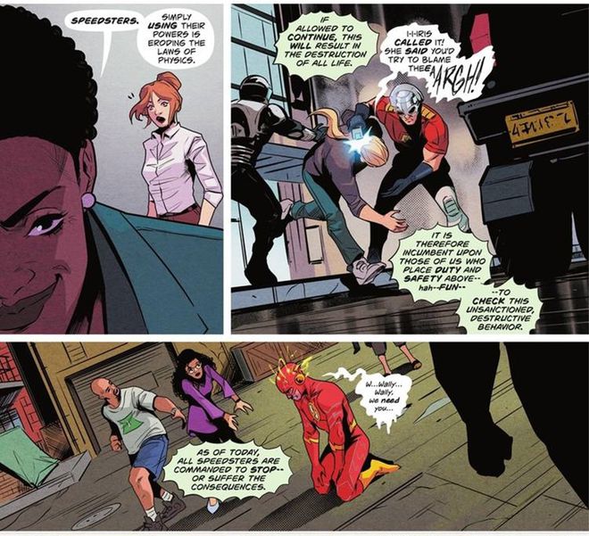 Em The Flash #8, lançado recentemente, Waller usa sua influência para manipular políticas públicas contra o herói. Isso mesmo, o Velocista Escarlate enfrenta o banal e perigoso poder da burocracia. Na trama, com Wally desaparecido, Barry Allen e os outros velocistas lutam para conter os desastres dimensionais que surgem em todo o mundo.