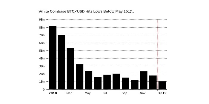 A Coinbase, outra popular empresa de câmbio, também teve uma queda similar em suas atividades. Em janeiro deste ano, as transações alcançaram um pouco mais de 1 bilhão em Bitcoins nos Estados Unidos – uma queda de 7 bilhões se comparado ao mesmo período em 2018.