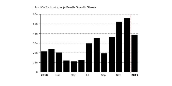 A baixa do mercado conseguiu parar até o crescimento da OKEx no último trimestre de 2018. A criptomoeda de Hong Kong viu seu volume de transação cair abaixo de 4 bilhões pela primeira vez desde novembro, o que quebrou o período de três meses de crescimento contínuo.