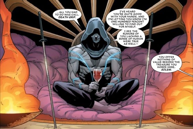 O mutante chamado Solem negocia as Lâminas Muramasa com o vilão Death Grip (Imagem: Reprodução/Marvel Comics)
