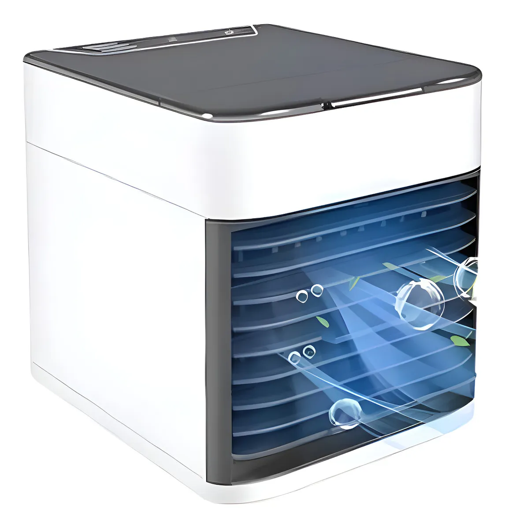 O Air Cooler Box LED é a versão mais básica e barata do mercado, vendida por várias marcas. Com tanque lateral e conexão USB, serve apenas para um ventinho úmido pontual ao lado do notebook. Não espere alta durabilidade. Preço: R$ 50 a R$ 70.