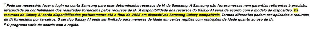 Um mês antes, em janeiro deste ano, outra nota de rodapé nos materiais oficiais da fabricante trouxe a mesma informação de que o Galaxy AI pode exigir assinatura a partir de 2026.