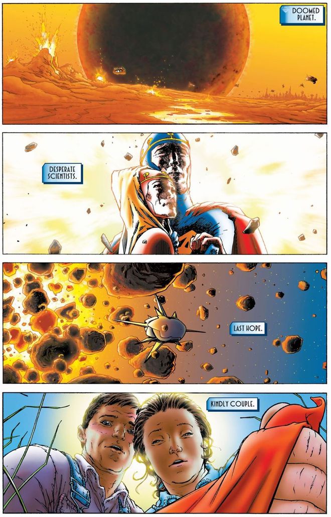 Em All-Star Superman #1, lançado em 2006, o artista Frank Quitely transformou a revisão da origem do Homem de Aço no roteiro de Grant Morrison em uma representação gráfica definitiva: um painel mostra um “Planeta Ameaçado”, enquanto destaca a expressão facial de “Cientistas Desesperados”, seguindo para uma pequena nave singrando o espaço como “Última Esperança”, até chegar ao “Casal Gentil” abrindo um paninho vermelho do cobertor de um provável bebê.