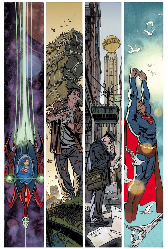 A variante do artista Danny Earls para Superman #15 mostra a origem icônica de Clark Kent em apenas quatro painéis: o primeiro mostra o bebê Kal-El voando para a Terra através do espaço, o segundo com Clark ainda jovem levantando vários fardos de feno na fazenda Kent, o terceiro tem Clark navegando em Metrópolis e o último painel destaca Superman voando.